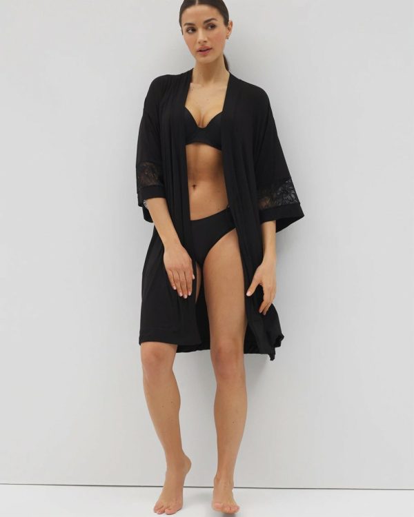 - Elbow-length kimono-style sleeves with lace trim