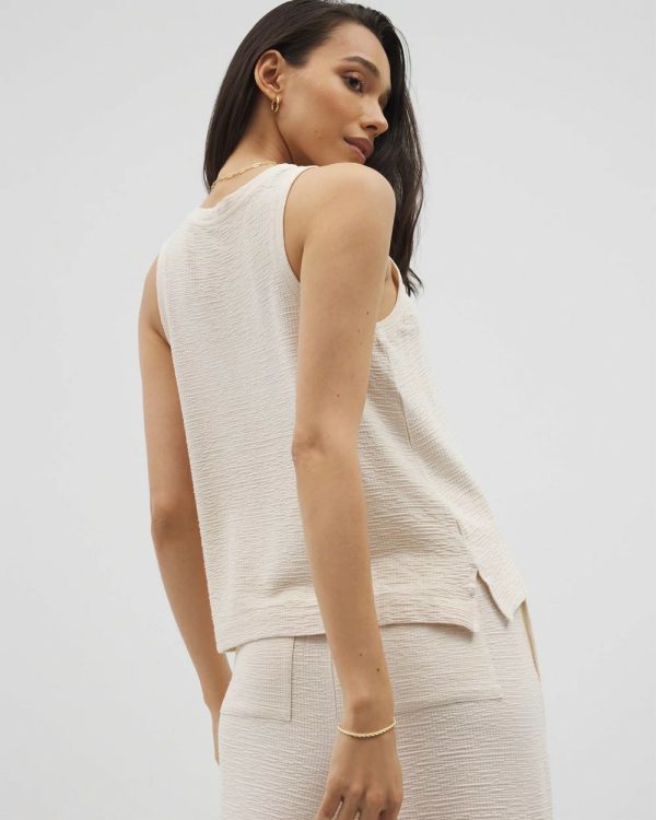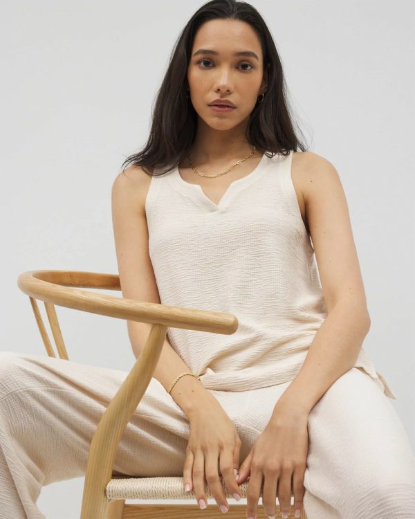 Airy light with a soft + stretchy textured feel, our new crinkle knit collection is full of pieces you can pair with anything. Throw on this breezy tank when you want to wear something comfy, cute, and versatile.